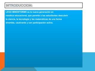 LEGO MINDSTORMS es un sistema de robótica educativa que permite a los estudiantes construir y programar robots utilizando ladrillos LEGO inteligentes, sensores y motores. Los estudiantes pueden construir robots siguiendo instrucciones, programarlos mediante software y probar sus programas, aprendiendo sobre ciencia, tecnología, ingeniería y matemáticas de forma divertida y práctica.
