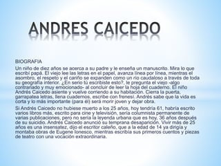 Este documento presenta una biografía del escritor colombiano Andrés Caicedo. Resume que Caicedo comenzó a escribir a una edad temprana y creía que lo más importante era morir joven y dejar una obra. Caicedo murió por suicidio a los 25 años y se ha convertido en una leyenda urbana. También destaca que gran parte de su obra se habría perdido de no ser por sus amigos que publicaron sus escritos póstumamente. Finalmente, señala que Los Rolling Stones fueron una gran influencia en