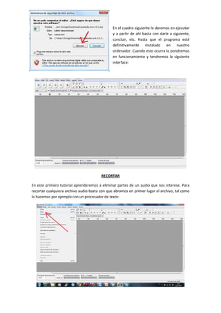 Audacity es un programa de código abierto gratuito para editar audio. Permite seleccionar una parte de un archivo de audio o cambiar el volumen. Para instalar Audacity, se descarga el programa desde su página web, se ejecuta el archivo de instalación, y luego se puede usar la interfaz para abrir archivos de audio, seleccionar secciones, y guardar el audio editado en diferentes formatos.