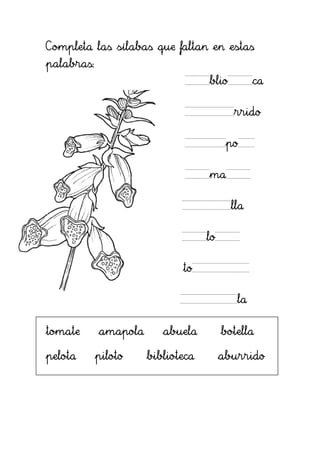 El documento presenta una serie de ejercicios de ortografía y lectura para niños en edad escolar. Incluye instrucciones para rodear sílabas en palabras dadas, completar sílabas faltantes en palabras, completar oraciones con palabras del recuadro y escribir palabras que contengan determinadas sílabas.