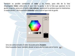Este documento explica cómo cambiar el formato de texto en PowerPoint, incluyendo la fuente, el tamaño, y el color usando el menú Formato o la barra de formato. Primero se selecciona el texto, luego se accede al menú Formato para cambiar la fuente o se usa la lista desplegable de color para modificar el color del texto seleccionado.