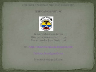 Este documento contiene información sobre el Colegio Nacional Nicolás Esguerra, incluyendo los nombres y calificaciones de dos estudiantes, Juan Esteban Díaz Parrra y Juan David Mora Corredor, así como las direcciones de correo electrónico de un profesor y monitor.