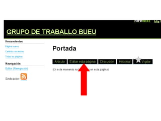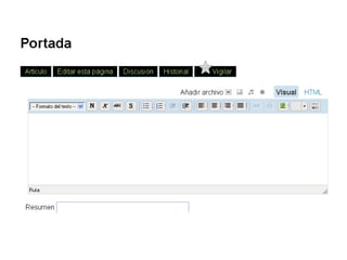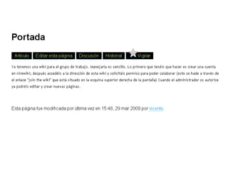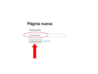 El documento describe los pasos para crear una página nueva en Nirewiki para alojar presentaciones tutoriales, incluyendo la creación de un índice enlazado en la página principal y una página de "instrucciones" enlazada en el menú de navegación, de modo que los visitantes anónimos también puedan acceder a las instrucciones.