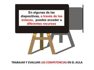 Este documento presenta información sobre cómo trabajar y evaluar las competencias en el aula. Explica que la competencia es la capacidad de realizar una tarea en un contexto determinado y está compuesta por conocimientos, habilidades y actitudes. Luego, describe ocho competencias clave y ofrece ejemplos de indicadores de evaluación e instrumentos para evaluar las competencias a través de tareas y producciones de los estudiantes. Finalmente, incluye dos ejemplos detallados de tareas y cómo permiten trabajar y evaluar múltiples competencias.