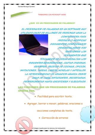 Este documento describe las funciones básicas de un procesador de palabras como Microsoft Word. Explica que es un software utilizado para crear y modificar documentos compuestos principalmente de texto, como cartas, informes y libros. Luego detalla las cuatro etapas típicas de producción de documentos usando un procesador de palabras: planeación y creación, edición, dar formato e impresión. Finalmente, brinda ejemplos de las herramientas de edición y formato disponibles.