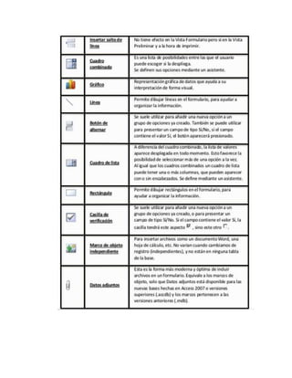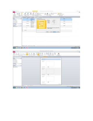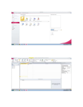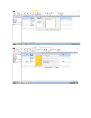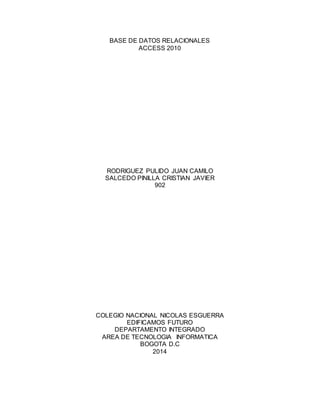 Este documento presenta una introducción a las bases de datos relacionales en Access 2010. Explica conceptos clave como tablas, formularios, informes, consultas y macros. Detalla cómo crear y modificar las vistas de diseño de tablas y formularios, y los pasos para generar informes a partir de los datos almacenados en las tablas.