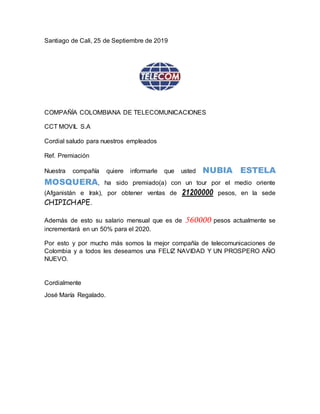 La compañía colombiana de telecomunicaciones CCT Móvil S.A. informa que varios empleados han sido premiados con un tour por el Medio Oriente por sobrepasar las metas de ventas en sus respectivas sedes. Además, sus salarios mensuales serán incrementados en un 50% para el 2020. La compañía desea a todos una feliz Navidad y próspero año nuevo.