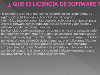 El documento describe la piratería de software como el uso ilegal de software sin licencia, incluyendo copiar e instalar software en más de un computador, distribuir copias sin permiso, o descargar software sin licencia. Explica que una licencia de software es un contrato entre el propietario del software y el usuario que establece los términos y condiciones para el uso legal del software. Además, resume que la ley colombiana requiere que las empresas reporten el cumplimiento de las leyes de propiedad intelectual, y que la tasa actual de piratería de software