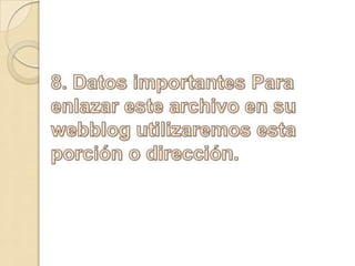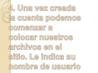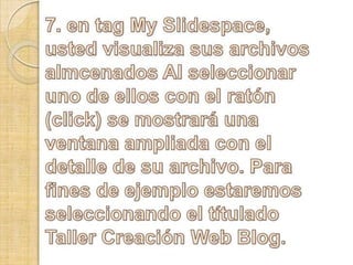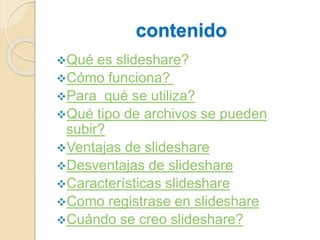 Slideshare es un sitio web creado en 2006 que permite a los usuarios subir y compartir presentaciones en formato PowerPoint, OpenOffice y otros. Ofrece una cuenta gratuita donde almacenar y publicar presentaciones para compartir fácilmente sin adjuntar archivos pesados. Facilita la colaboración entre personas de un equipo de trabajo o institución independientemente de su ubicación geográfica.