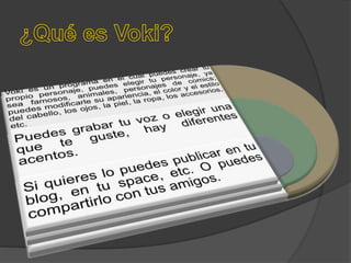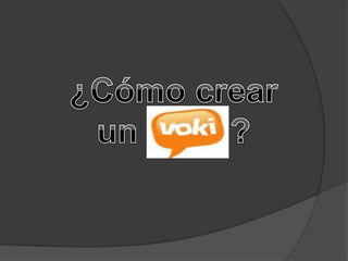 Voki es un programa de animación que permite crear personajes animados personalizados con diferentes características como cabello, ropa y accesorios. Se puede usar Voki para crear mensajes, presentaciones personales u organizar debates, y es una herramienta útil para docentes. El primer paso para crear un Voki es registrarse en la página web www.voki.com y luego elegir la opción "CREATE A NEW VOKI".