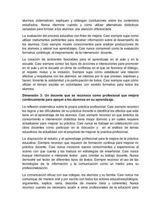 Este documento evalúa el trabajo docente y la innovación de un estudiante durante su quinto semestre. Resume sus fortalezas y áreas de mejora en cinco dimensiones clave: conocimiento de los estudiantes y currículo, organización de la enseñanza y evaluación, reflexión y mejora profesional, planes de clase, e innovación y evaluación de propuestas. El estudiante demostró un sólido conocimiento de estrategias didácticas y relaciones con estudiantes, pero se identificaron oportunidades para mejorar su comprensión de contenidos