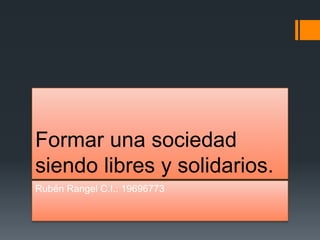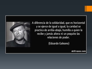 Este documento define la solidaridad y la libertad. Explica que la solidaridad es apoyar causas de otros con sentimientos compartidos e incluye varios tipos como la política, económica y social. También define la libertad como no estar sujeto a la voluntad de otros y tener el derecho a tomar decisiones propias, aunque conlleva responsabilidades de no dañar a otros. Finalmente, menciona que violar la libertad de los demás es considerado un delito.