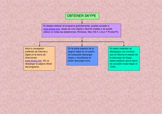 Skype es un programa gratuito que permite enviar mensajes instantáneos, realizar llamadas de voz y videollamadas a bajo costo. Los usuarios pueden descargar e instalar Skype, crear una cuenta con su nombre, correo electrónico y contraseña, e importar contactos para comunicarse a través de mensajes, llamadas o videollamadas. El programa ofrece una interfaz sencilla con contactos, conversaciones y herramientas para realizar pruebas de audio, llamadas y cre
