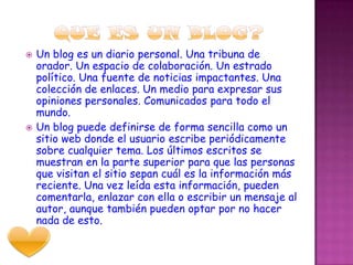 Un blog puede definirse como un sitio web donde el usuario publica contenido de forma periódica sobre cualquier tema. Los blogs permiten la interacción entre el autor y los lectores a través de comentarios. Existen varias plataformas para crear blogs de forma gratuita como WordPress, Blogger y BlogSome.