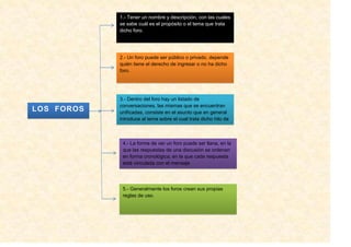 1. El documento habla sobre los foros en internet, que son sitios donde las personas pueden publicar mensajes y comentarios sobre diferentes temas para discutir y compartir información.