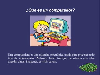 Una computadora es una máquina electrónica que se usa para procesar información de varios tipos, como hacer trabajos de oficina, guardar datos e imágenes, comunicarse a través de correo electrónico, ver videos y más. Está compuesta de hardware, que son los componentes físicos como la CPU y memoria, y software, que son los programas como procesadores de texto y sistemas operativos.