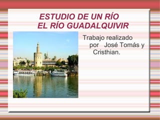El río Guadalquivir nace en la Sierra de Cazorla en Jaén a 1300 metros de altitud, tiene una longitud de 657 km y desemboca en Sanlúcar de Barrameda en Cádiz. Sus principales afluentes son los ríos Genil, Guadiato y Guadalquivir. Pasa por importantes ciudades como Córdoba y Sevilla, y el hombre aprovecha sus aguas para regadío, energía e industria.