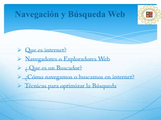 Este documento presenta información sobre navegación y búsqueda web. Explica que Internet es una red de redes que interconecta computadoras y redes a través de protocolos como TCP/IP. Los navegadores permiten a los usuarios acceder a los recursos de Internet y los buscadores facilitan la búsqueda de información en la web a través de palabras clave. También describe diferentes tipos de enlaces y operadores de búsqueda básicos y avanzados.