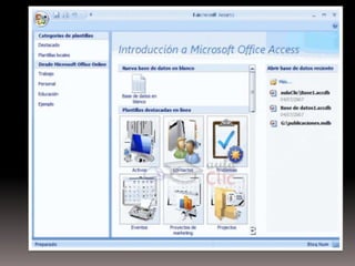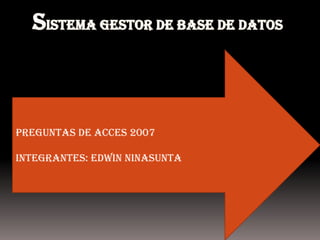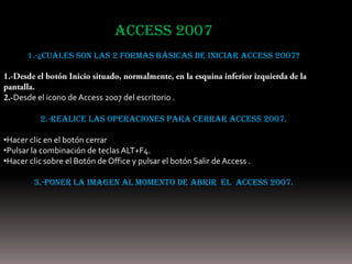 Este documento contiene 10 preguntas sobre Access 2007. Detalla cómo iniciar y cerrar Access 2007, los elementos de la barra de título y barra de acceso rápido, y los pasos para crear una base de datos, tabla, y consulta de referencia cruzada, incluyendo cómo definir el tamaño de los campos y especificar el origen de la consulta.
