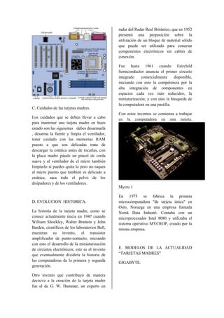 El documento resume las tarjetas madres, explicando que son el componente principal de una computadora que conecta los demás elementos. Explica que su importancia radica en conectar dispositivos al PC y permitir su comunicación. Brevemente describe los cuidados básicos de una tarjeta madre y su evolución histórica desde los primeros circuitos integrados hasta modelos actuales de empresas como Gigabyte.