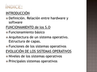 El documento describe la definición y evolución de los sistemas operativos. Explica cómo funcionan los sistemas operativos, incluyendo su arquitectura de capas y principales funciones. También detalla varios sistemas operativos importantes como MS-DOS, Windows, Mac OS, UNIX y sus versiones.