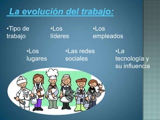 Este documento describe la evolución del trabajo a través del tiempo. Ha cambiado de un enfoque manual a uno industrial y de servicios, influenciado por factores como la tecnología, los líderes y los empleados. También ha cambiado el espacio de trabajo, desde conventos en el siglo IV hasta oficinas móviles y teletrabajo en la actualidad. El trabajo continúa adaptándose a los cambios sociales y tecnológicos.