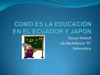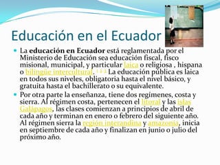 La educación en Ecuador está regulada por el Ministerio de Educación y comprende la educación preescolar, la educación general básica de 1er a 10mo grado, y el bachillerato. La educación pública es laica y obligatoria hasta el nivel básico. El país tiene dos regímenes educativos, costa y sierra, que difieren en las fechas de inicio y finalización del año escolar.