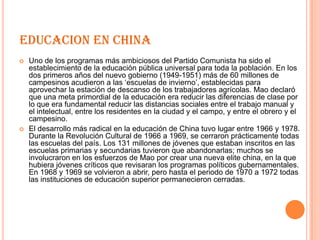 El documento presenta información sobre la educación en China. En tres oraciones resume lo siguiente: