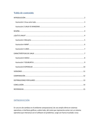 Este documento describe el sistema operativo Linux. Explica que Linux es un sistema operativo gratuito y de código abierto desarrollado originalmente por Linus Torvalds. Detalla algunas de las características clave de Linux como su naturaleza multiusuario, multitarea y su compatibilidad con múltiples plataformas hardware. También menciona algunas de las distribuciones más populares de Linux como Ubuntu, Mint y OpenSUSE.