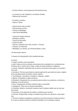 Mariátegui analiza la realidad peruana desde la época inca hasta su época en 7 ensayos, examinando temas como la evolución económica, la situación del indígena, la tierra y la educación. Uno de los ensayos analiza el factor religioso, describiendo cómo la iglesia inca era una institución política y cómo tras la conquista se produjo una mezcla del culto católico con prácticas incas. Mariátegui muestra preocupación por cómo las formas religiosas están lig