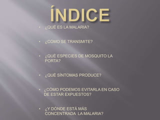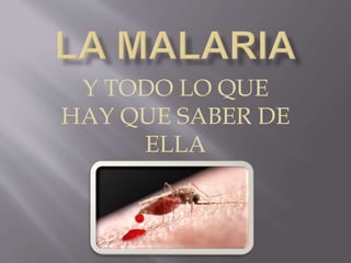 La malaria es una enfermedad causada por parásitos del género Plasmodium que se transmiten a través de la picadura de mosquitos hembras del género Anopheles. Los síntomas incluyen fiebre, escalofríos y dolores musculares que ocurren en ciclos. La malaria es endémica en muchas regiones de África, Asia y América del Sur, donde las medidas para prevenir las picaduras de mosquitos son cruciales para reducir su propagación.