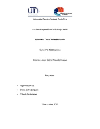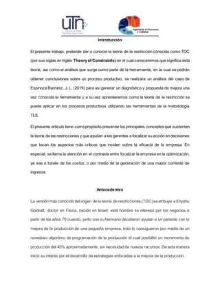 La teoría de la restricción (TOC) analiza los cuellos de botella y limitaciones en los procesos productivos para mejorar el rendimiento. El documento presenta los conceptos clave de TOC y su aplicación para aumentar el valor agregado en una línea de ensamble de grupos electrógenos de 80% a través de herramientas como DMAIC y Lean Manufacturing. TOC identifica la restricción, maximiza su capacidad y coordina el resto del sistema para apoyarla, mejorando continuamente el proceso.