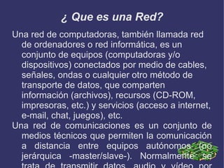 Una red de computadoras es un conjunto de equipos conectados que comparten información e recursos. Internet es una red descentralizada de redes interconectadas que usan protocolos TCP/IP para funcionar como una red lógica global. El internet juega un papel importante en la vida de los humanos al facilitar la comunicación y proveer una herramienta para la investigación y la ciencia.