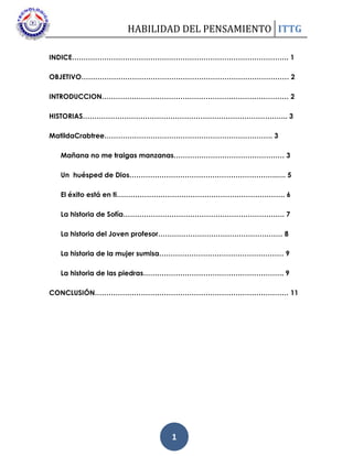 Este documento presenta 7 historias que ilustran conceptos relacionados con la inteligencia emocional y la habilidad del pensamiento. Las historias cubren temas como la comunicación asertiva, el auto respeto, la toma de decisiones difíciles y el poder sanador del amor. El objetivo general es mostrar cómo el desarrollo de estas habilidades mejora la vida cotidiana de las personas en el ámbito familiar, social y laboral.