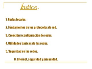 Este documento resume los principales conceptos sobre redes y seguridad informática. Explica los tipos de redes como LAN, WAN y MAN, los componentes básicos de una red como servidores, estaciones de trabajo e impresoras, y los protocolos de red. También describe los pasos para crear y configurar redes, las utilidades básicas de las redes como compartir información e impresoras, y los conceptos de seguridad en redes e Internet como usar contraseñas seguras y antivirus.