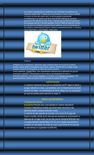El documento analiza por qué los estudiantes de 8o grado prefieren estar conectados en sus celulares chateando en lugar de prestar atención en clase. Explora qué redes sociales y celulares son los más utilizados, así como las causas por las que los estudiantes se distraen con sus dispositivos. Realiza una encuesta a estudiantes para determinar sus hábitos de uso de redes sociales y celulares.