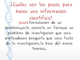 Este documento describe los 11 pasos para realizar una investigación científica: 1) Formular un problema de investigación, 2) Identificar factores importantes, 3) Formular hipótesis, 4) Recopilar información, 5) Probar hipótesis, 6) Analizar resultados, 7) Reconsiderar la teoría, 8) Formular nuevas preguntas, 9) Seleccionar un tipo de investigación, 10) Seguir un proceso riguroso que incluye elegir un tema, objetivos, delimitar el tema, plantear el problema, marco teórico,