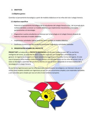 El documento presenta el planteamiento de un proyecto llamado "Project Wit" cuyo objetivo es contribuir al pensamiento tecnológico de los niños del ciclo 1 del colegio Venecia a través de modelos didácticos. El proyecto propone implementar un modelo didáctico en forma de tortuga llamada "Tortuga Wit" que contenga mecanismos simples para atraer la atención de los niños y enseñar conceptos tecnológicos de manera lúdica. Adicionalmente, se propone diseñar un