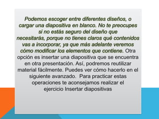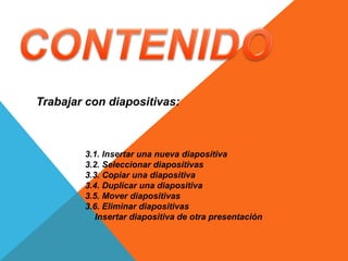 Este documento proporciona instrucciones sobre cómo trabajar con diapositivas en PowerPoint, incluyendo cómo insertar, seleccionar, copiar, duplicar, mover y eliminar diapositivas. Explica los pasos para realizar cada una de estas acciones utilizando los botones, menús y combinaciones de teclas.