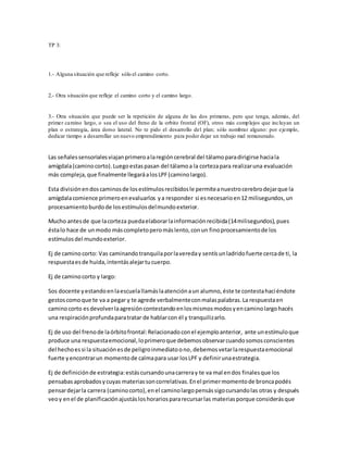 El documento presenta ejemplos de situaciones que reflejan el camino corto, el camino largo y el uso combinado de ambos caminos en la toma de decisiones. Específicamente, da un ejemplo de respuesta inmediata ante un estímulo (camino corto), un ejemplo donde se evalúa la situación de forma más compleja considerando también la respuesta emocional (camino largo), y un ejemplo donde se define una estrategia que involucra planificación para resolver un problema (uso del freno orbitofrontal y áreas cerebrales más complejas).
