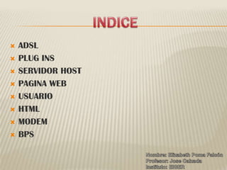 Este documento resume varios conceptos clave relacionados con Internet y la World Wide Web. Define ADSL como una tecnología de banda ancha para acceso a Internet, plug-ins como módulos que agregan funcionalidad a sistemas más grandes, y servidores host como los puntos de inicio y fin de transferencias de datos en la web. También explica que las páginas web son documentos en la web conectados por hipervínculos, y que HTML es el lenguaje de marcado usado para estructurar y complementar páginas web con objetos de
