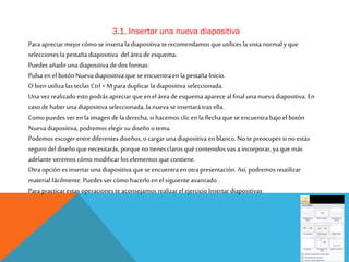 Este documento describe diferentes operaciones para trabajar con diapositivas en PowerPoint, incluyendo insertar nuevas diapositivas, seleccionar diapositivas, copiar y duplicar diapositivas, mover diapositivas entre posiciones, e eliminar diapositivas. Proporciona instrucciones detalladas sobre cómo realizar cada operación usando la interfaz de PowerPoint o atajos de teclado.