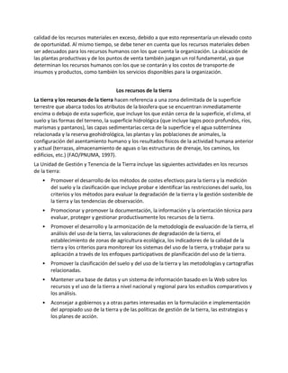 El documento describe los diferentes tipos de recursos materiales y renovables, incluyendo el suelo, la flora y la fauna. Explica que el suelo es un recurso clave que se forma a través de un proceso largo y complejo, y que tanto la flora como la fauna juegan un papel importante en la formación y mantenimiento de los suelos fértiles. También define los diferentes tipos de energía renovable como la solar, eólica, hidroeléctrica y geotérmica, y explica que deben ser manejados de manera s