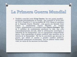 La Primera Guerra Mundial fue un conflicto global que comenzó en 1914 y terminó en 1918, originado por las tensiones entre las potencias europeas de la época. Más de 9 millones de combatientes perdieron la vida en este conflicto que transformó el equilibrio político mundial y trajo profundos cambios sociales y tecnológicos. El Tratado de Versalles al finalizar la guerra impuso duras condiciones a Alemania que generaron amargura y sentaron las bases para un nuevo conflicto.