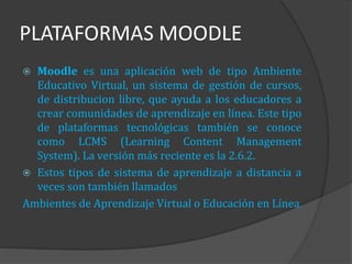 Moodle es una aplicación web gratuita y de código abierto creada por Martin Dougiamas para crear comunidades de aprendizaje en línea. Se basa en teorías constructivistas que promueven el aprendizaje colaborativo y centrado en el estudiante. Moodle ofrece varias herramientas y actividades para apoyar diferentes estilos de enseñanza y aprendizaje a distancia o presencial.