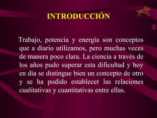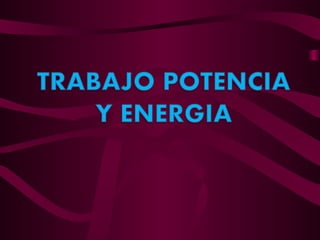 El documento define los conceptos de trabajo, fuerza y energía en física. Explica que el trabajo mecánico ocurre cuando una fuerza desplaza un objeto, y que se calcula como el producto de la fuerza paralela al desplazamiento por la magnitud del desplazamiento. También establece que la variación en la energía cinética de un objeto es igual al trabajo neto realizado por las fuerzas sobre ese objeto.