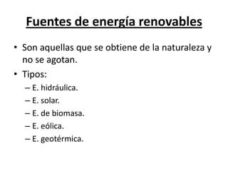 Este documento describe las diferentes fuentes de energía, dividiéndolas en renovables (hidráulica, solar, biomasa, eólica y geotérmica) y no renovables (carbón, petróleo, gas natural y nuclear). Explica brevemente cada una indicando sus ventajas e inconvenientes. Las fuentes renovables se obtienen de procesos naturales que no se agotan, mientras que las no renovables son limitadas.