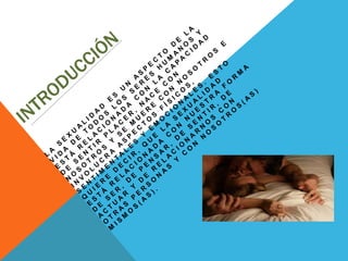 La sexualidad humana es un tema complejo que involucra factores biológicos, psicológicos y sociales. Existen diversas orientaciones sexuales como la heterosexualidad, homosexualidad y bisexualidad. Es importante practicar sexo de forma segura para prevenir enfermedades de transmisión sexual. Los jóvenes menores de 24 años deben realizarse exámenes al menos una vez al año debido a que tienen mayor riesgo de contraer estas enfermedades.