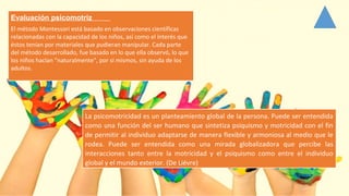 El documento presenta información sobre diferentes pruebas y métodos de evaluación psicomotriz para niños en edades preescolares y escolares. Describe brevemente el método Montessori, el enfoque de la psicomotricidad, y varios tests como el MSCA, el test de Litwin y Fernández, el test de dominancia lateral de Harris y el examen psicomotor de Picq y Vayer. También incluye una planificación de clase de educación física para prebásica.
