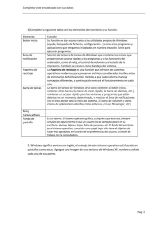 Este documento describe los elementos básicos del escritorio de Windows, incluyendo el botón de inicio, área de notificaciones, papelera de reciclaje, barra de tareas, y otros. Explica la función de cada elemento y proporciona imágenes para identificarlos. También describe el panel de control y algunas de sus funciones como agregar hardware, programas, cuentas de usuario, y configuración de pantalla, mouse, teclado y otros.